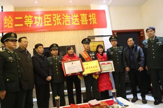 當(dāng)日上午,張潔的老家鑼鼓喧天,熱鬧非常。軍地領(lǐng)導(dǎo)在鄉(xiāng)親們熱烈地掌聲和鑼鼓聲中,帶著滿滿地祝福,專程趕到張潔家中。“張潔同志,在國際軍事比武競賽中取得第一名,榮立二等功為此特向您報喜。希望您今后多與部隊聯(lián)系,多給予張潔同志鼓勵,為實現(xiàn)中華民族偉大復(fù)興的強國夢、強軍夢共同奮斗?!痹趶垵嵓抑校?9246部隊副政委楊富鵬代表組織宣讀了部隊賀信。