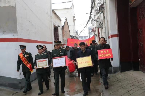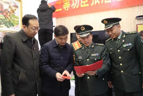 隨后,周口軍分區(qū)政治部主任李揚,太康縣委副書記、政法委書記劉海艇,縣委常委、副縣長韓維俊,縣委常委、人武部部長于永前,人武部政委郭立君等領(lǐng)導(dǎo)給張潔的母親盧靈芝送去了立功喜報、二等功臣家庭牌匾和慰問品、慰問金。