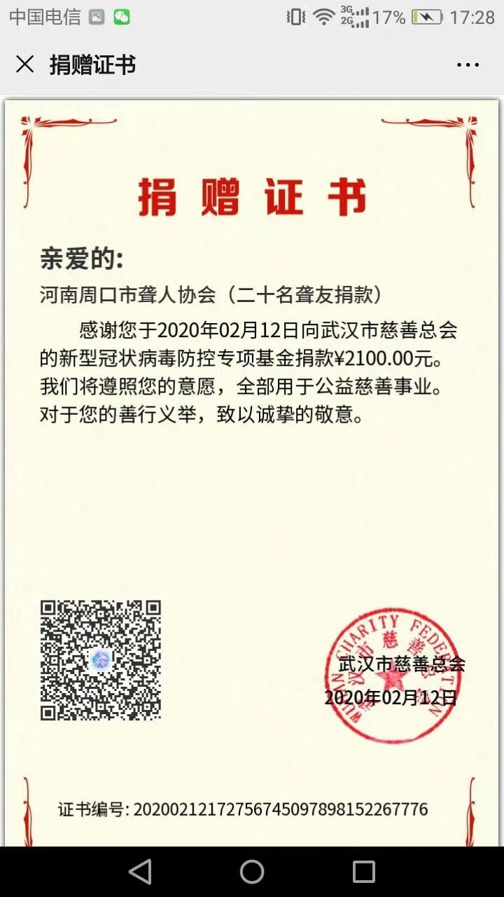 2月12日,2100元的捐款轉(zhuǎn)到了武漢市慈善總會(huì),這是來(lái)自河南周口市聾人協(xié)會(huì)20名聾友的一份愛(ài)心。