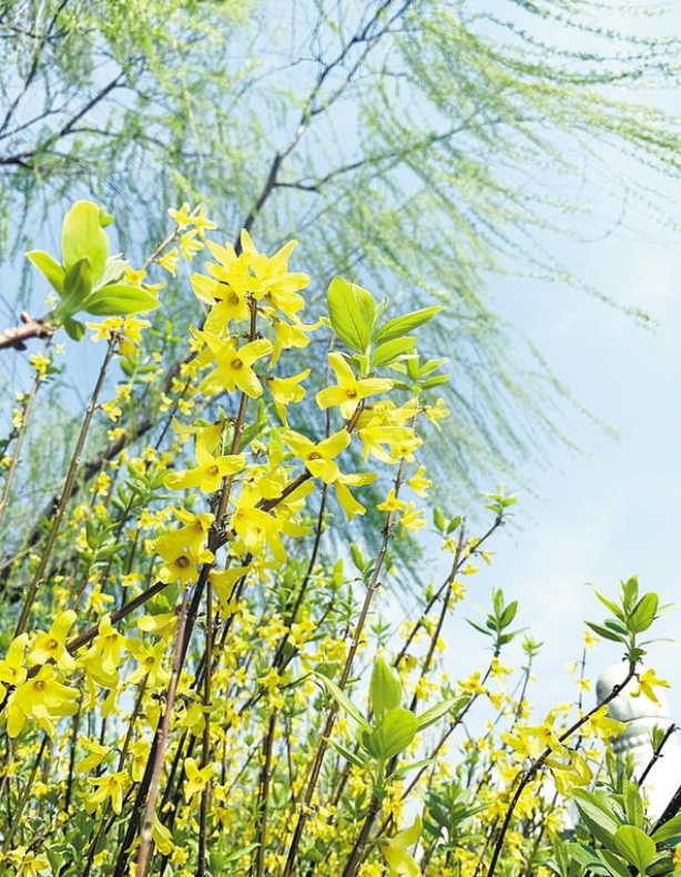 作為春天的信使,一叢叢嬌黃的連翹花,為大地帶來了濃濃春意?;ǘ湓诖猴L(fēng)的吹拂下?lián)u曳,團(tuán)團(tuán)簇簇,涌動如金色波浪。走近之時(shí),聞花香淡雅、賞滿枝金黃,人們也以“報(bào)春花”來稱呼它。