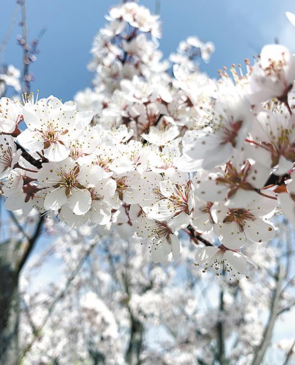 “一葉春風(fēng)吹動蕾,紅葉李花妍漫天?!奔t葉李又名紫葉李,屬薔薇科。走近觀看,細(xì)細(xì)密密的粉白色繁花開滿枝頭,在紫色葉子的襯托下,顯得別致、靚麗。遠(yuǎn)遠(yuǎn)望去,像是爛漫層疊的櫻花,又宛如飄落大地的云霞,為春天平添幾分嫵媚、幾分浪漫。