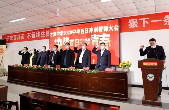 誓師大會現(xiàn)場,才源中學校長張醒民向九年級階段負責人授戰(zhàn)旗。師生代表面對直播鏡頭向全體初三師生發(fā)出鏗鏘誓言,號召大家奮勇爭雄,2020年再奪中考全市領先的佳績。誓詞為:凌志擎天,豪氣滿懷;天道酬勤,樂戰(zhàn)不??;意堅心恒,信念常在;以我雄心,征戰(zhàn)未來;沖刺百日,只為無悔青春;人生綻放,定是風雨兼程;今日苦讀書厲兵秣馬,明朝進重點吐氣揚眉。