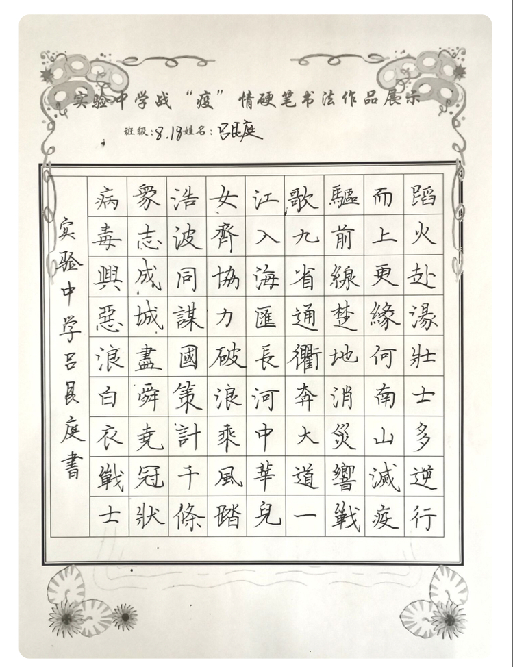 “赴湯蹈火壯士多,逆行而上更緣何。南山滅疫驅(qū)前線,楚地消災(zāi)響戰(zhàn)歌。九省通衢奔大道,一江入海匯長(zhǎng)河。中華兒女齊協(xié)力,破浪乘風(fēng)踏浩波......”扶溝縣實(shí)驗(yàn)中學(xué)“萬(wàn)眾一心 抗擊新冠”硬筆書法比賽中,八(18)班呂艮庭同學(xué)鄭重地抄錄了這首律詩(shī)。