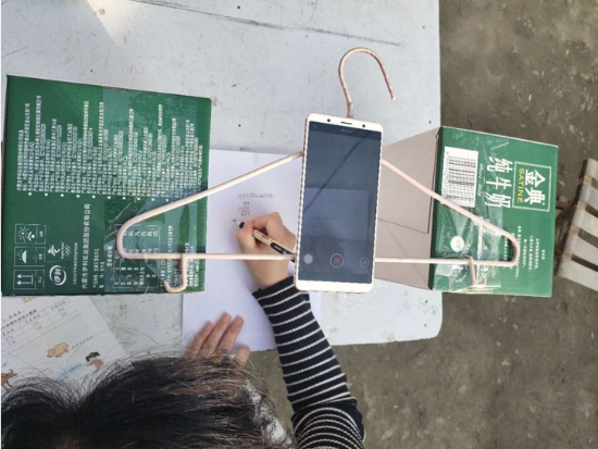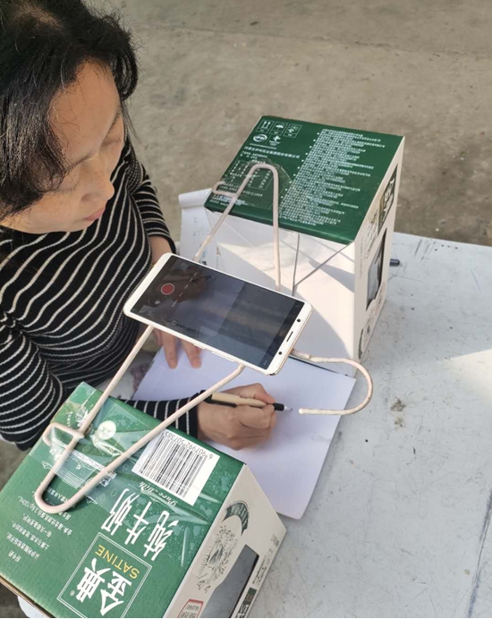 在備課時(shí),朱霞很快遇到了難題:手機(jī)沒法固定,街上手機(jī)店又全部停業(yè),網(wǎng)上買的手機(jī)固定夾發(fā)不了貨。為了不耽誤學(xué)生上課,她想到用晾衣?lián)?、牛奶箱做成?jiǎn)易支架,組裝后居然效果不錯(cuò)。就這樣,一個(gè)晾衣?lián)?、兩個(gè)牛奶箱和一部手機(jī)組成了她的“三尺講臺(tái)”。