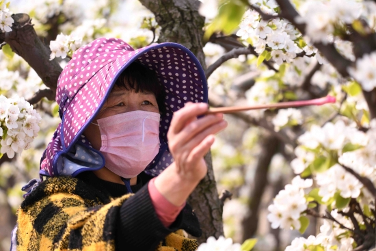 泛區(qū)農(nóng)場的萬畝果園不僅吸引著游客觀光游覽,而且盛產(chǎn)的桃、梨、蘋果,品質(zhì)好,味道好,吸引著商家訂購,為果農(nóng)帶來可觀的經(jīng)濟(jì)收入。目前,給梨花授粉是果農(nóng)在花期中最重要的工作,上圖為果農(nóng)正緊張地給梨花授粉。