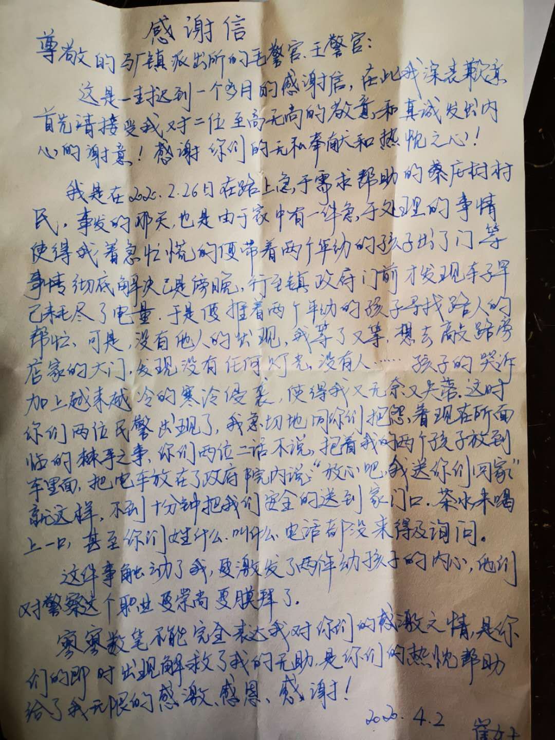 今年2月26日晚9時(shí)許,太康縣馬廠派出所民警劉華偉和輔警王以鶴、毛明陽例行每天夜間治安巡邏,巡邏到馬廠鎮(zhèn)黃莊行政村時(shí),遇到一女士帶著一個(gè)5歲和一個(gè)7歲的小朋友。該女士哭著說急需去馬廠衛(wèi)生院給5歲的小孩看病,可走到半路電動(dòng)車沒電了。民警們立即把求助人的電動(dòng)車就近停放妥當(dāng),把兩名小朋友抱上警車,駕駛警車趕往馬廠衛(wèi)生院。到達(dá)后又聯(lián)系急診醫(yī)生診斷并拿好藥物。