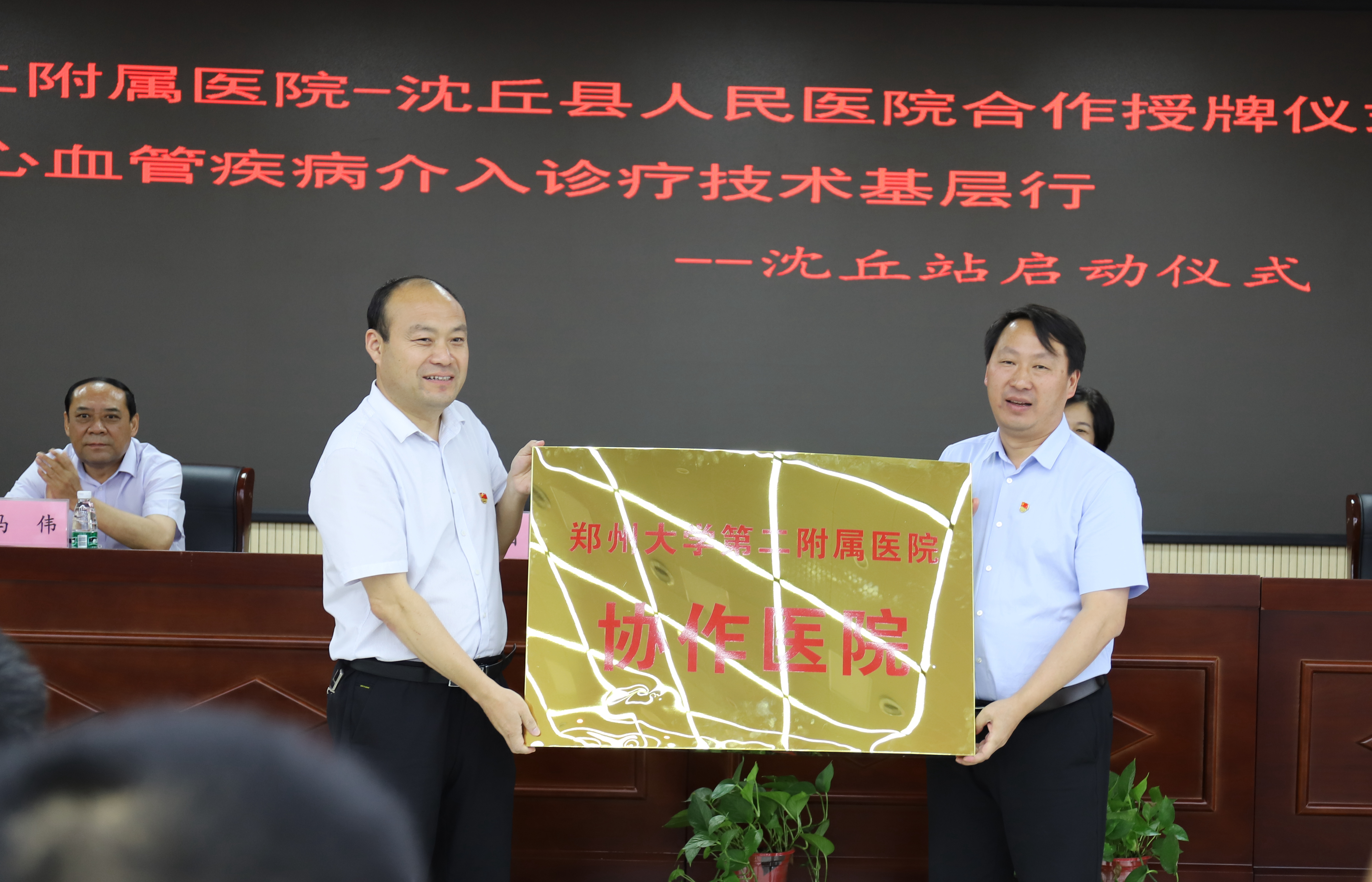 隨后,鄭大二附院副院長(zhǎng)簡(jiǎn)立國(guó)為沈丘縣人民醫(yī)院授協(xié)作醫(yī)院牌。沈丘縣人民醫(yī)院院黨委書記歐陽(yáng)劍為鄭大二附院的簡(jiǎn)立國(guó)院長(zhǎng)及心血管內(nèi)科各位教授專家頒發(fā)特聘專家證書。沈丘縣衛(wèi)健委張治君在總結(jié)講話中指出,縣醫(yī)院與鄭州大學(xué)第二附屬醫(yī)院建立友好協(xié)作關(guān)系,不僅對(duì)縣醫(yī)院是個(gè)很好的發(fā)展機(jī)遇,也是該縣醫(yī)療衛(wèi)生工作走大靠強(qiáng)道路的具體體現(xiàn),是醫(yī)療衛(wèi)生戰(zhàn)線上的一件大喜事,對(duì)加快醫(yī)療衛(wèi)生事業(yè)發(fā)展,有效的解決廣大人民群眾看病貴、就醫(yī)難的問題,將起到積極的推動(dòng)作用。希望鄭州大學(xué)第二附屬醫(yī)院的領(lǐng)導(dǎo)和專家們常來(lái)指導(dǎo),兩家醫(yī)院能夠友好協(xié)作,共同發(fā)展。