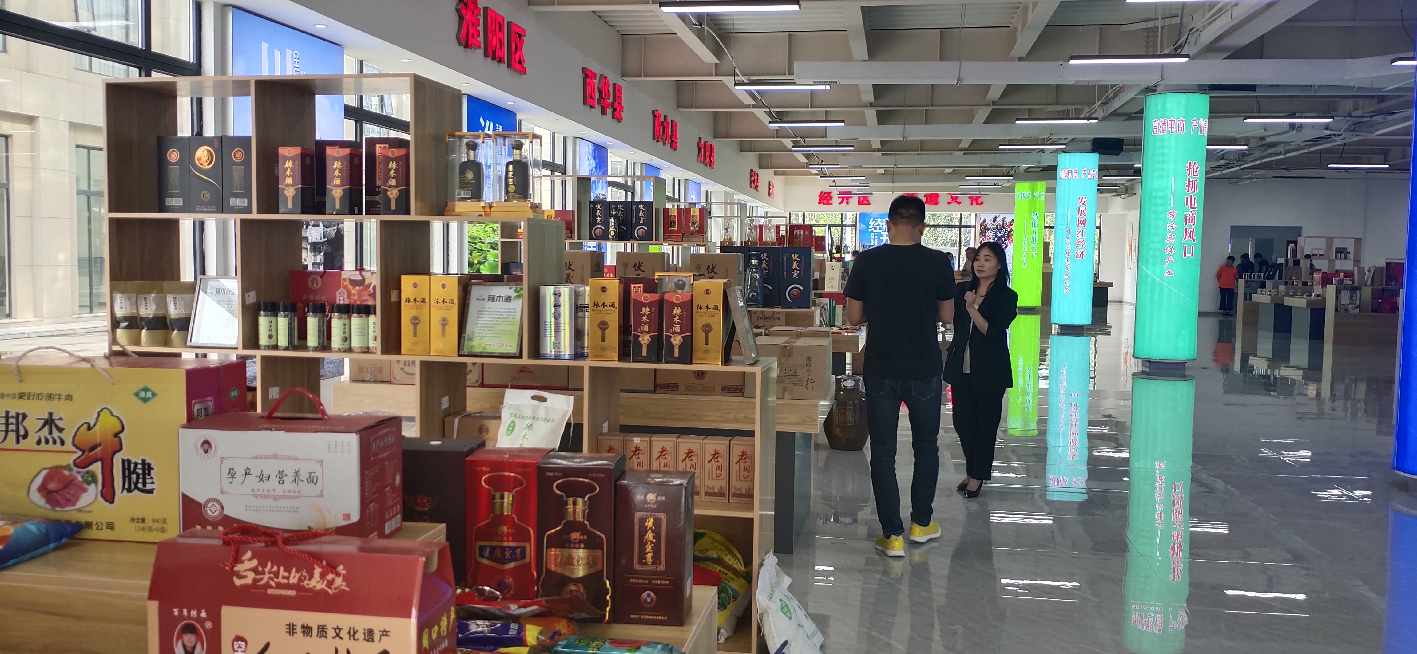 中心展廳面積達(dá)1000多平方米,按照不同縣(市、區(qū))劃分為十幾個(gè)區(qū)域,集中展示邦杰牛肉、伏羲貢酒、鄧城豬蹄、汝陽劉毛筆、三川豫龍復(fù)合肥等周口產(chǎn)品。這些產(chǎn)品都是來自各縣(市、區(qū))等地農(nóng)工副土特產(chǎn)品以及非遺產(chǎn)品?!拔覀儗⑼ㄟ^抖音、快手等視頻平臺,把這些產(chǎn)品銷往全國各地?!?該基地負(fù)責(zé)人、周口東方會展商會會長于海崗說。