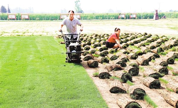 8月10日,扶溝縣韭園鎮(zhèn)小王莊村貧困戶閆新生、趙貞正在收割草坪。目前,小王莊村共發(fā)展草坪種植1100多畝,有30多戶建檔立卡貧困戶通過(guò)出租土地和管理草坪實(shí)現(xiàn)了穩(wěn)定收入,僅草坪一項(xiàng)戶均年收入可達(dá)4000元以上。谷志方 攝