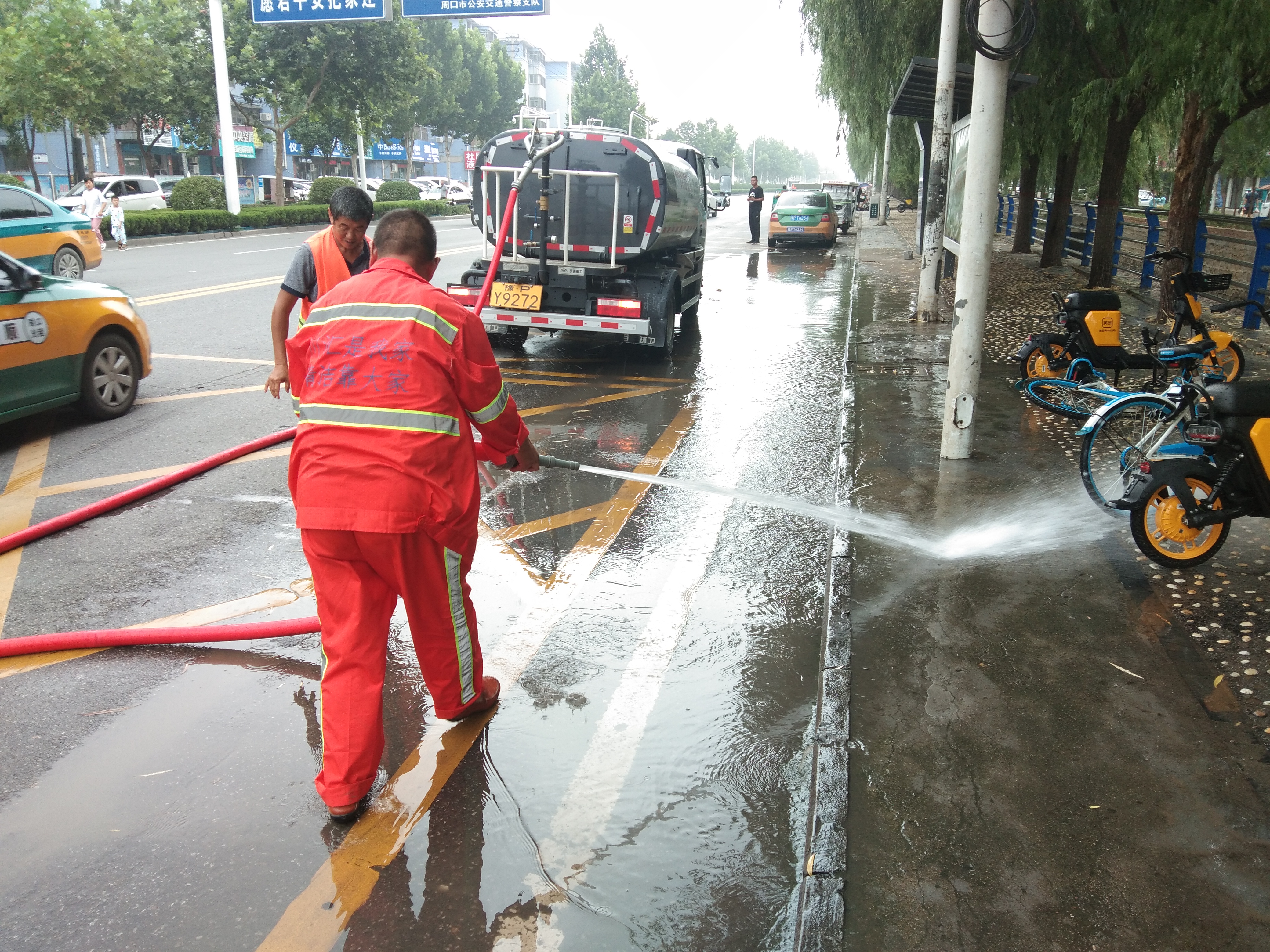 8月23日上午,記者在周口中心城區(qū)大慶路與交通大道交叉口附近看到,工作人員正在對(duì)一些人工難以清掃干凈的路面進(jìn)行高壓沖洗作業(yè),為“創(chuàng)衛(wèi)”貢獻(xiàn)力量,讓市民有一個(gè)良好出行環(huán)境。