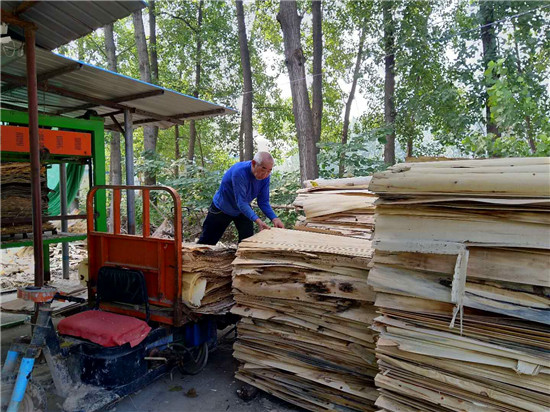 8月28日,商水縣練集鎮(zhèn)馬莊村的四紅木業(yè)有限公司板材加工車間內(nèi),機器轟鳴,工人忙著斷木、打圓、卷板,一張張板材被切割后,拉到曬板場晾曬?!坝辛诉@份收入,去年全家脫貧摘帽。”正在車間里搬運板材的馬莊村貧困戶王天林對記者說。
