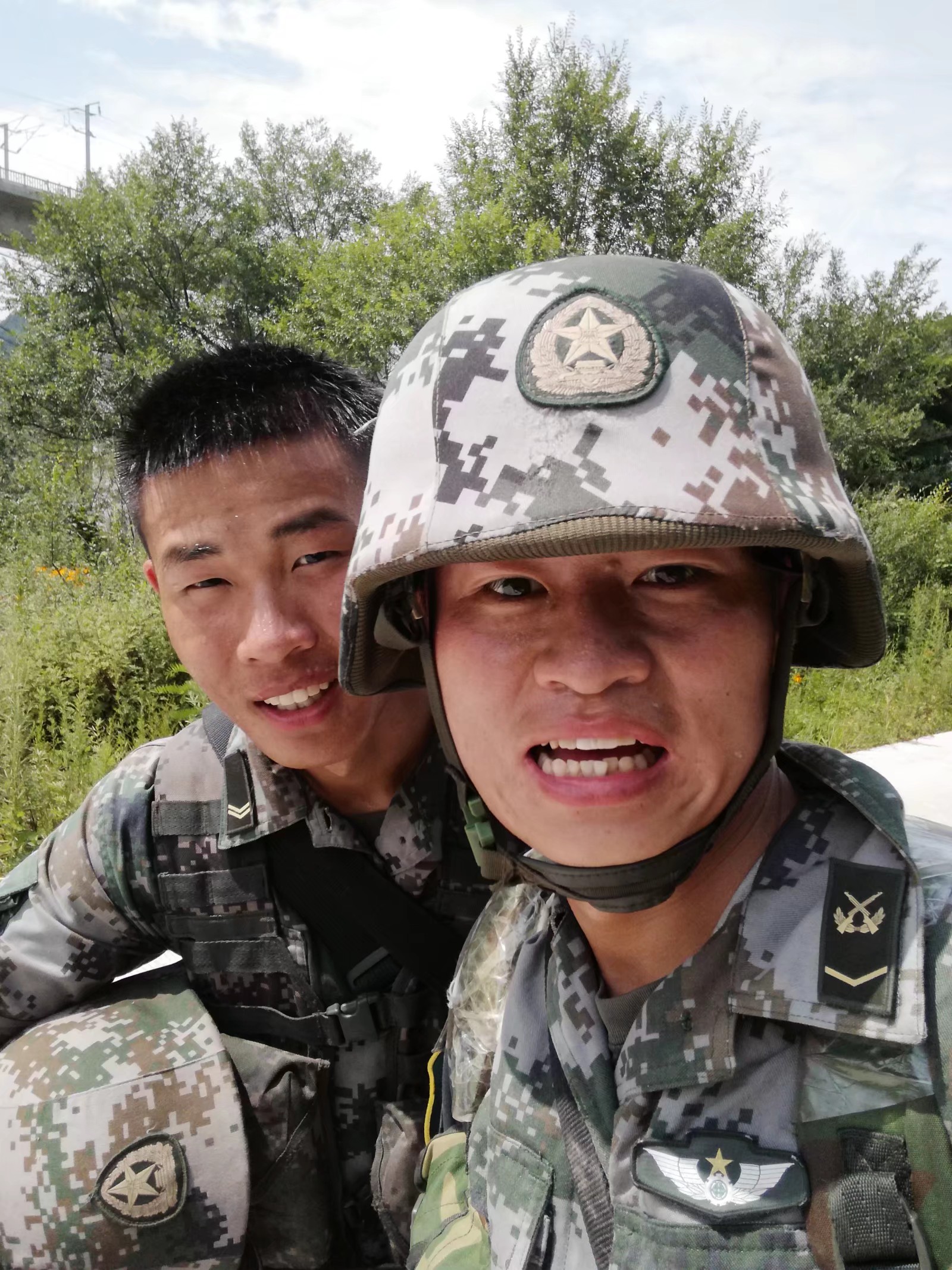 蛙跳、鴨子步、俯臥撐、側(cè)身敬禮、蹲起……盡管汗流浹背,兩位“老兵”在新兵面前沒(méi)有一絲疲倦,充分展現(xiàn)了軍人的風(fēng)采,也流露出了兩位青年向往軍營(yíng)的堅(jiān)定意志。