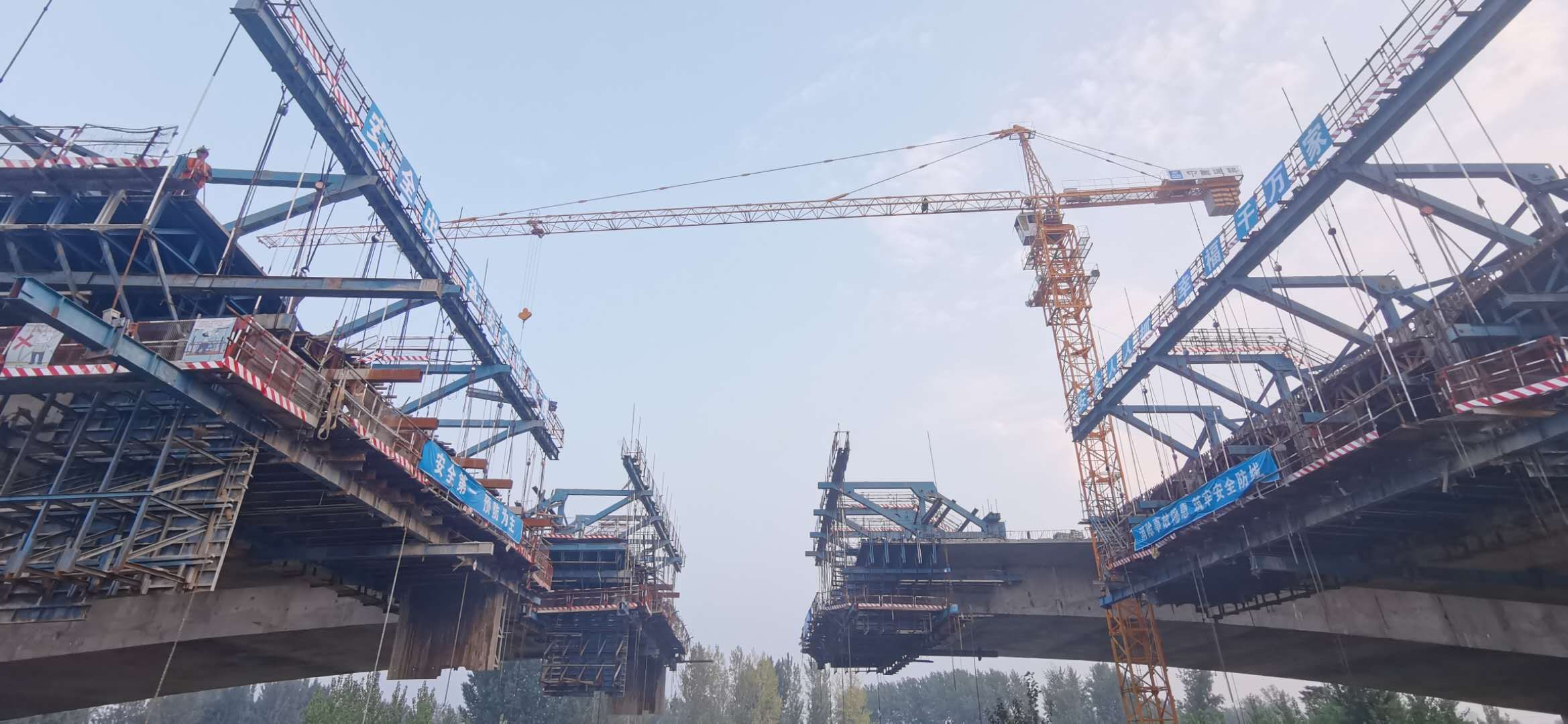 該橋東西兩側引橋采用40米預應力箱梁,全橋40米預制箱梁252片,東側引橋梁板架設已全部完成正在進行橋面系施工,西側引橋已架設半幅。主橋采用預應力變截面連續(xù)現(xiàn)澆梁,懸澆段共16個節(jié)段,采用四套菱形掛籃;左幅已施工至15號節(jié)段,即將開始合龍段施工;右幅已施工至12號節(jié)段。