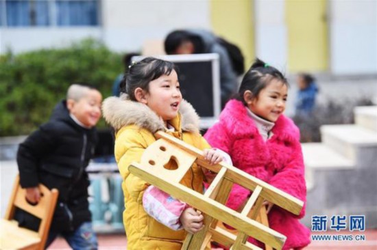 重慶市石柱土家族自治縣中益鄉(xiāng)小學(xué)的同學(xué)們搬著小椅子前往操場(chǎng)觀看文藝表演。當(dāng)日,“我的中國(guó)夢(mèng)——文化進(jìn)萬家”中國(guó)視協(xié)文藝志愿服務(wù)小分隊(duì)走進(jìn)中益鄉(xiāng)小學(xué),為師生們帶來精彩的文藝表演(2019年12月12日攝)。新華社記者王全超 攝