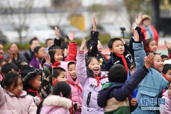 重慶市石柱土家族自治縣中益鄉(xiāng)小學(xué)的同學(xué)們?cè)谖乃囇莩霈F(xiàn)場(chǎng)與演員互動(dòng)。當(dāng)日,“我的中國(guó)夢(mèng)——文化進(jìn)萬家”中國(guó)視協(xié)文藝志愿服務(wù)小分隊(duì)走進(jìn)中益鄉(xiāng)小學(xué),為師生們帶來精彩的文藝表演(2019年12月12日攝)。新華社記者王全超 攝