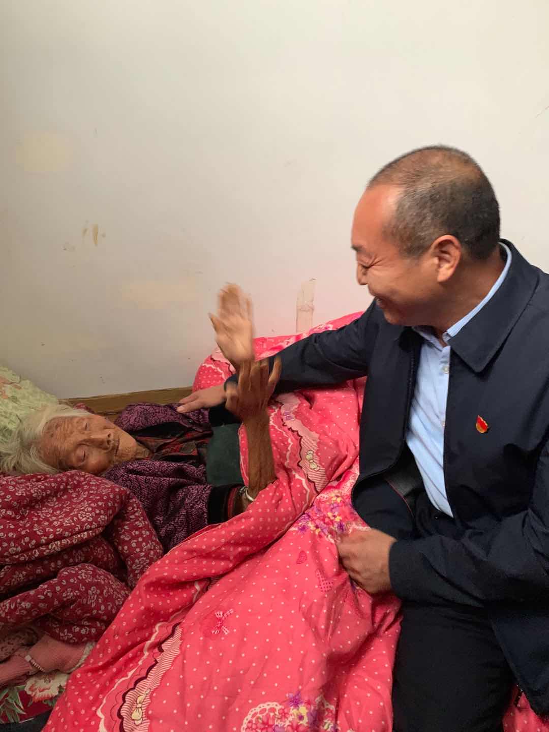 這天,方凱一行帶著嶄新的棉衣、大米、食用油等禮品,首先來(lái)到磨臺(tái)村看望107歲的老人胡有蘭。躺在床上的老人雖年逾百歲,一眼看見方凱,就認(rèn)出來(lái)了,激動(dòng)地說(shuō):“孩子,你又來(lái)了?”說(shuō)著,就急忙拉住方凱的手,緊緊地握著。看老人不方便坐起來(lái),方凱便坐在老人身邊,笑著說(shuō):“是的。娘,兒子來(lái)看您啦!”