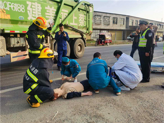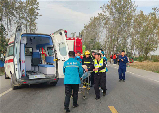 周口市商水縣公安局交警大隊(duì)為提高民警處置國、省道市縣結(jié)合部路段道路交通事故應(yīng)急救援能力,第一時(shí)間救助受傷人員,最大限度將交通事故造成的人員傷亡、財(cái)產(chǎn)損失、環(huán)境污染等危害后果降低到最小限度。10月26日下午3時(shí),在周口市交警支隊(duì)事故科王領(lǐng)科長的協(xié)調(diào)指揮下,商水縣公安局交警大隊(duì)聯(lián)合駐馬店市上蔡縣公安局交警大隊(duì),在223省道(原219省道)商水縣與上蔡縣交界處的上蔡縣華陂鎮(zhèn)賴莊路段,模擬大貨車與微型貨車發(fā)生事故現(xiàn)場(chǎng),演練省道市際突發(fā)道路交通事故應(yīng)急救援行動(dòng)。