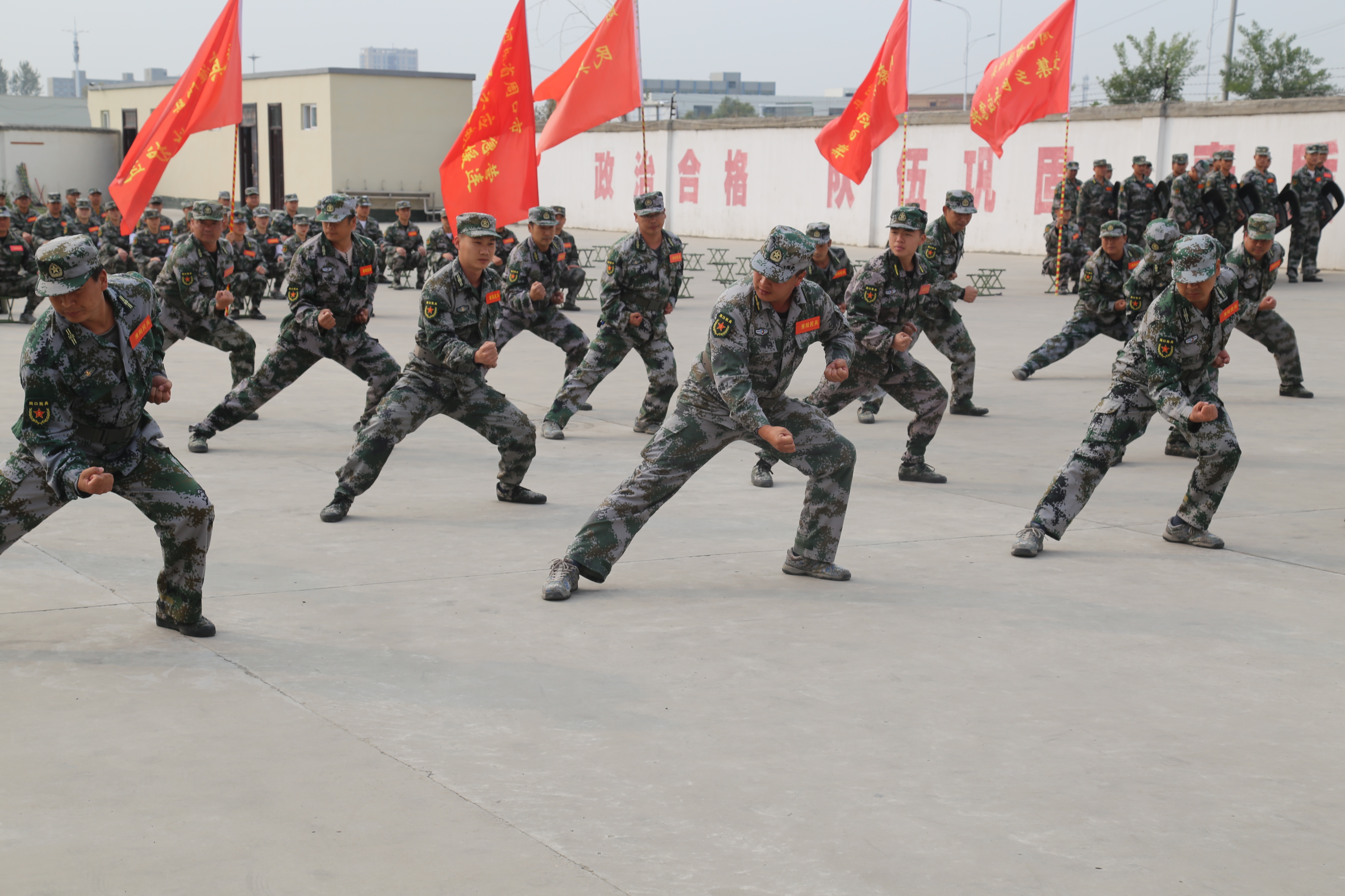成果匯報現(xiàn)場,殺聲震天,紅旗招展。軍體拳、警棍盾牌操、戰(zhàn)場救護、摔擒訓(xùn)練、單個軍人隊列動作、防爆隊形、隊形運動等訓(xùn)練項目一一上演,每位民兵的一舉一動、一招一式,都展現(xiàn)了基干民兵“聽黨指揮、能打勝仗、作風(fēng)優(yōu)良”的強軍目標,展現(xiàn)了大家召之即來、來之能戰(zhàn)、戰(zhàn)之必勝的優(yōu)良作風(fēng),受到了軍地領(lǐng)導(dǎo)的一致好評。