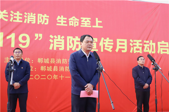 11月11日,鄲城縣在世紀(jì)廣場舉行2020年消防宣傳月活動(dòng)啟動(dòng)儀式,目的是進(jìn)一步提高全民消防安全意識(shí),促使“關(guān)注消防 生命至上”的主題深入人心,廣泛發(fā)動(dòng)社會(huì)各界關(guān)注消防、參與消防,營造良好的宣傳氛圍,預(yù)防和減少火災(zāi)事故發(fā)生,確保人民群眾生命財(cái)產(chǎn)安全??h長李全林出席會(huì)議并宣布消防宣傳月活動(dòng)啟動(dòng),縣委常委、常務(wù)副縣長胡友濤主持會(huì)議,縣領(lǐng)導(dǎo)謝超、王彪、陳鳳祥、李素梅及縣公安局政委趙紅建參加會(huì)議。