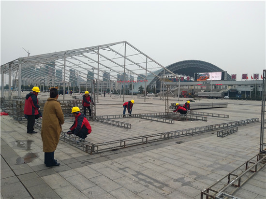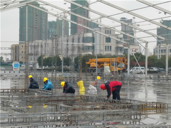 為迎接11月28日至30日舉辦的周商產(chǎn)品展示展覽活動(dòng),現(xiàn)場(chǎng)70余名施工人員不顧天氣惡劣,抓緊搶干工期,爭(zhēng)取在11月25日全面搭建完畢。