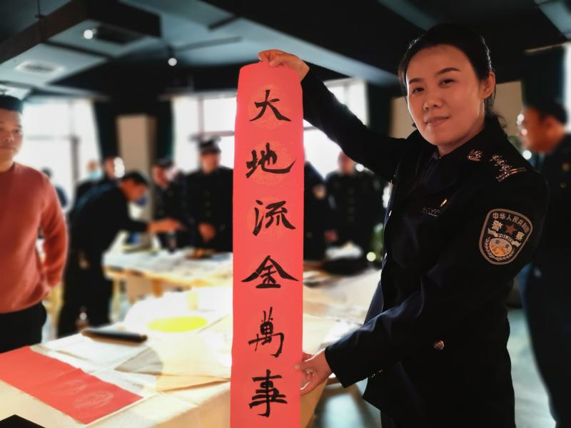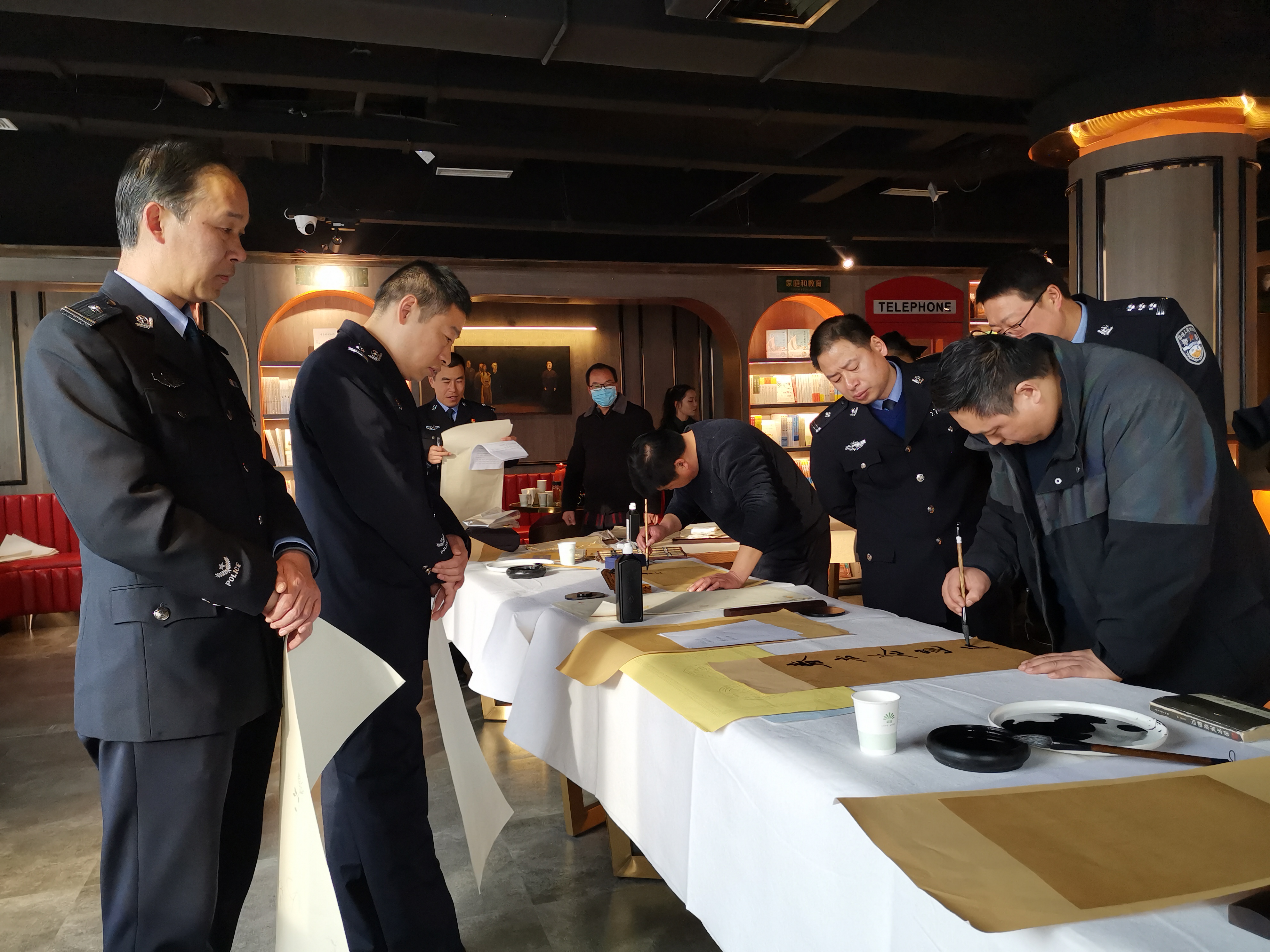 活動(dòng)現(xiàn)場(chǎng),氣氛熱烈,書(shū)法家們現(xiàn)場(chǎng)揮毫潑墨、筆走龍蛇,帶著喜迎牛年的美好祝愿。民警、輔警爭(zhēng)相圍觀,觀看、揣摩書(shū)法家們蒼勁有力的書(shū)法作品,房間內(nèi)洋溢著濃郁的節(jié)日氣息。