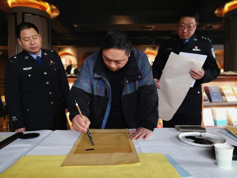 1月10日下午,沽讀書(shū)廊二樓翰墨飄香、筆鋒頓挫。為慶祝首個(gè)中國(guó)警察節(jié),書(shū)法家李為、何巖、陳濤、游富華、何祥峰、李雯云、軒敬賢以及祁庚鑫等一行,為川匯區(qū)公安分區(qū)民警義寫(xiě)書(shū)法作品,送來(lái)一份特殊的節(jié)日禮物。