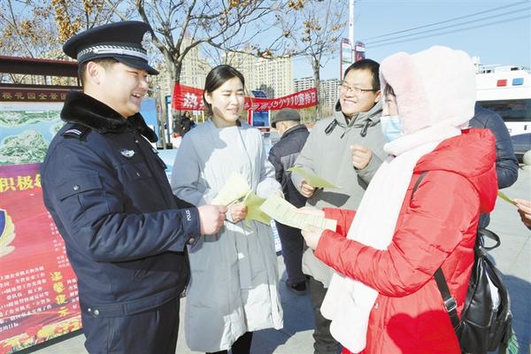 今年1月10日是第35個“110宣傳日”,也是首個“中國人民警察節(jié)”。我市公安系統(tǒng)圍繞“一心為民110,砥礪奮進新征程”這一主題,開展了大型宣傳活動。圖為扶溝公安民警向群眾發(fā)放宣傳資料。