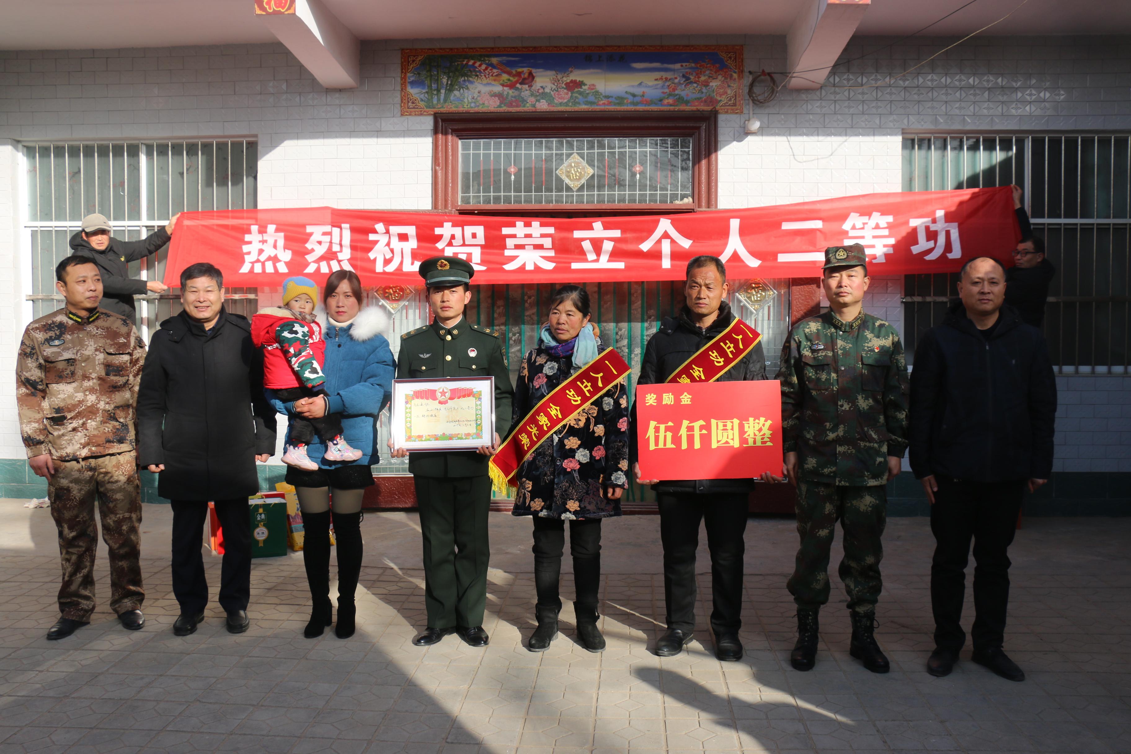 1月12日上午,西華縣西華營(yíng)鎮(zhèn)雙樓村某部士官高志豪家中鑼鼓喧天,喜氣洋洋。該縣人武部政委涂友佳、縣退役軍人事務(wù)局局長(zhǎng)龔坤敬一起把二等功喜報(bào)和“一人立功,全家光榮”的紅色綬帶及5000元現(xiàn)金等送到高志豪及其父母手中。