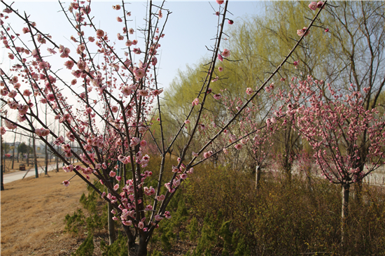一排排的玉蘭花盛開爭艷,紫色的、白色的玉蘭花高聳在褐色的枝杈間,美不勝收。梨花、杏花、桃花、梅花組成了一道花墻,青枝、綠葉、紅花搭配得恰到好處,令市民忍不住駐足觀賞。②7