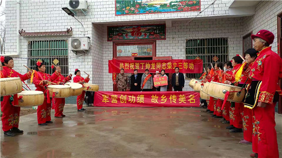 太康縣龍曲鎮(zhèn)的4名現(xiàn)役軍人在部隊(duì)榮立“三等功”,日前,太康縣龍曲鎮(zhèn)退伍軍人服務(wù)站站長(zhǎng)、市人大代表劉志華在太康縣軍人事務(wù)局領(lǐng)導(dǎo)的帶領(lǐng)下,吹著嗩吶、打著腰鼓、扯著橫幅,把立功喜報(bào)和慰問(wèn)金,送到龍曲鎮(zhèn)張山行政村張鵬舉、黑李王行政村丁帥龍、軒莊行政村師行光、河坡行政村王澤家中,營(yíng)造了一人當(dāng)兵、全家光榮的風(fēng)尚,堅(jiān)定了軍人建功立業(yè)的信心。