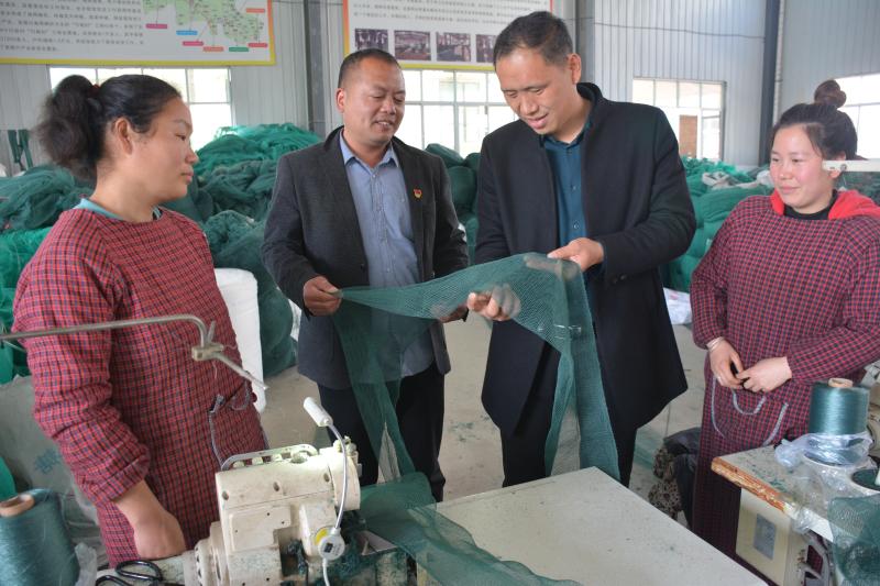 3月27日,商水縣平店鄉(xiāng)李崗村“商水縣龍巢網(wǎng)業(yè)公司”經(jīng)理羅國昌向村黨支部書記李金棋(左二)介紹漁網(wǎng)編織產(chǎn)業(yè)產(chǎn)銷帶貧情況。羅國昌和妻子劉清華2009年創(chuàng)辦漁網(wǎng)編織加工廠、2017年擴(kuò)建新區(qū),現(xiàn)有3個大型生產(chǎn)車間庫房,發(fā)展30多個分廠、40多個聯(lián)系點(diǎn),年產(chǎn)各種成品漁網(wǎng)500萬條,產(chǎn)品銷往國內(nèi)江蘇、安微、山東、河北、湖北等10多個省區(qū)和30多個沿??h市水產(chǎn)公司,部分出口到俄羅斯及東南亞地區(qū),年創(chuàng)產(chǎn)值約1.6億元,精準(zhǔn)幫扶225戶群眾脫貧,帶貧群眾有1萬余人。