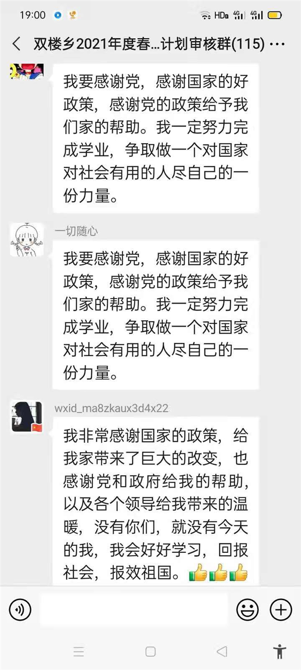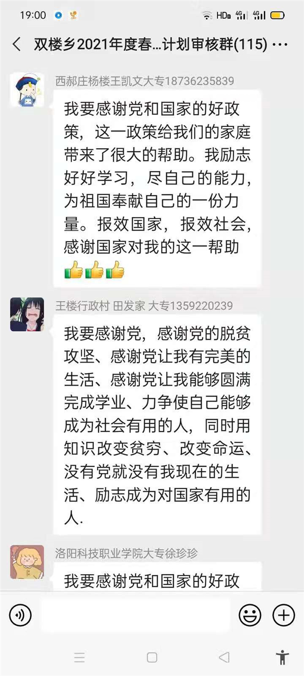 “感謝幫助過我家的所有幫扶人,沒有你們,就沒有我家今天的幸福生活,我們光榮脫貧了,作為貧困家庭中新成長勞動力,我一定珍惜這次來之不易的學習機會,好好學習技術,畢業(yè)后回村成為一名技術帶頭人,來促進家鄉(xiāng)產業(yè)的發(fā)展。”鄲城縣雙樓鄉(xiāng)孫莊村脫貧學生張素華在微信群里說。近幾天,鄲城縣雙樓鄉(xiāng)114人的大學生微信群里可熱鬧了,在鄉(xiāng)黨委政府的引導下,該鄉(xiāng)眾多脫貧后的大學生通過鄉(xiāng)里建起的微信群,紛紛圍繞“話脫貧、感黨恩、奮進新時代”這一主題交流思想,提振斗志。