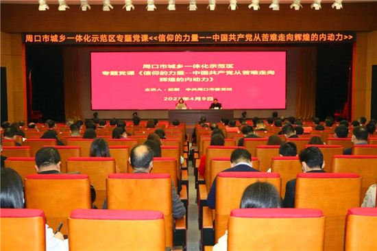 為貫徹落實(shí)習(xí)近平總書(shū)記黨史學(xué)習(xí)教育動(dòng)員大會(huì)重要講話精神,全面推進(jìn)全區(qū)黨史學(xué)習(xí)教育工作,4月9日上午,周口市城鄉(xiāng)一體化示范區(qū)組織專題黨課學(xué)習(xí),邀請(qǐng)中共周口市委黨校黨史黨建教研室主任,副教授紀(jì)穎講授《信仰的力量——中國(guó)共產(chǎn)黨從苦難走向輝煌的內(nèi)動(dòng)力》專題黨課,示范區(qū)副處級(jí)以上干部、區(qū)直全體黨員干部、鄉(xiāng)、辦、站、所負(fù)責(zé)人、全體村(社區(qū))支部書(shū)記參加會(huì)議。