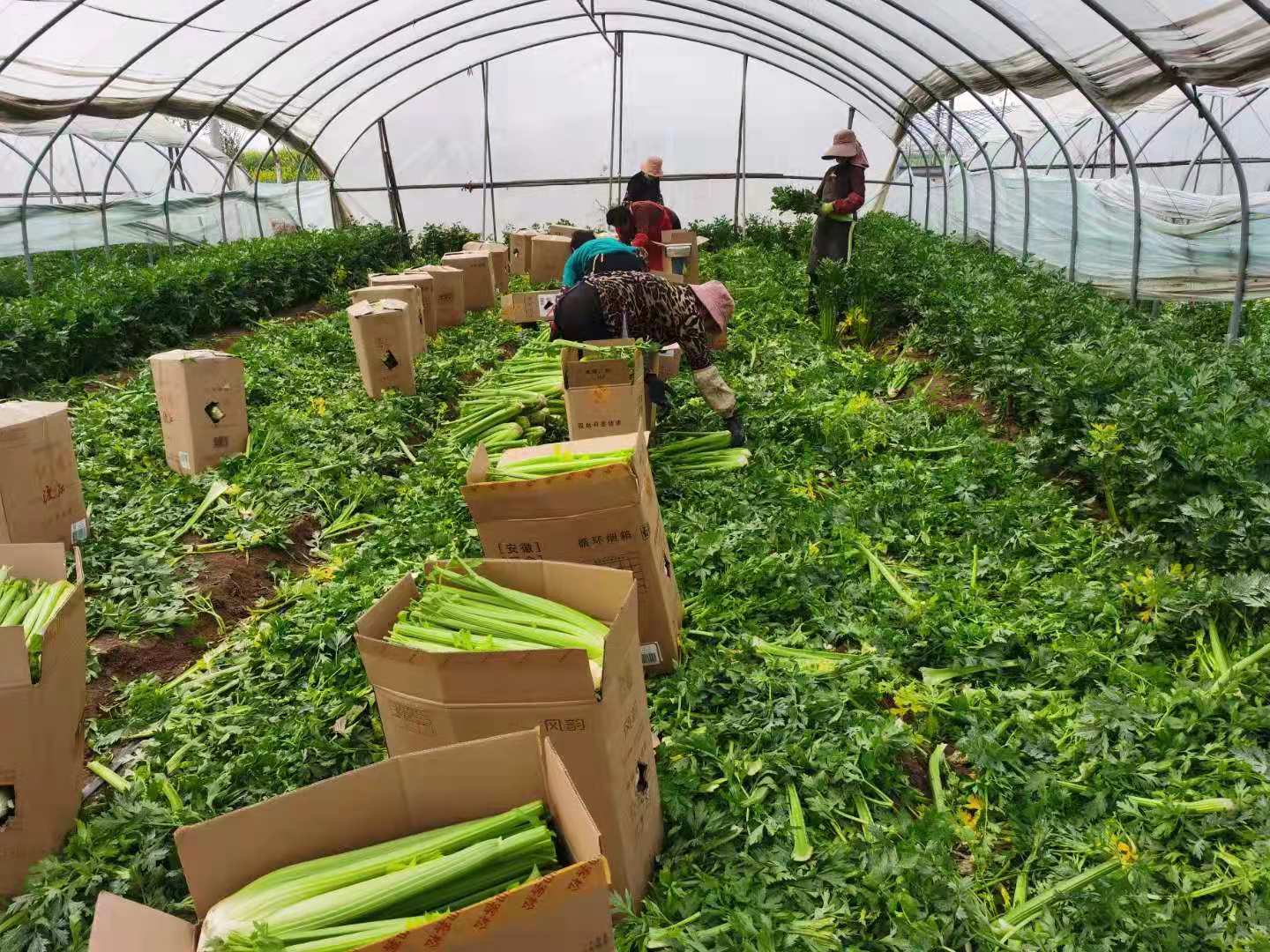 走進萬畝芹菜種植基地蔬菜溫棚,一股傘形科植物特有的芳香充滿鼻腔。抬眼一瞅,裝箱好的芹菜整齊碼放成垛,溫棚深處,還有大片未收割的芹菜,挺直鮮嫩,綠意蔥蘢。大棚里菜農(nóng)們收割、打包、貼二維碼一氣呵成,道路兩旁十幾名從全國各地趕來的收購商從菜農(nóng)手中接過包裹急忙裝車。