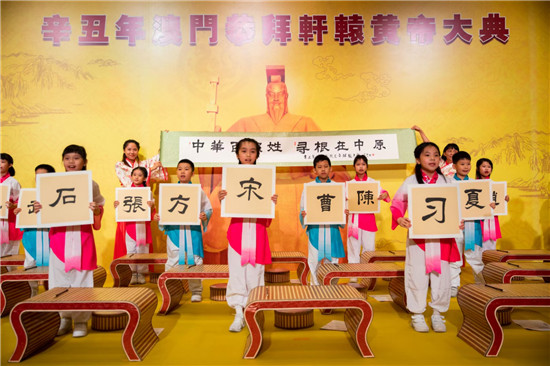 在儀程“高唱頌歌”環(huán)節(jié),30名澳門小學生身穿漢服,邊唱《黃帝頌》邊在小書桌上書寫毛筆字。隨后,孩子們舉起書寫的姓氏,后排兩名身穿漢服的老師打開“中華百家姓”卷軸,引來參加拜祖活動的來賓陣陣掌聲。今年拜祖活動現(xiàn)場組織了一個百人的漢服方陣,順應流行的“國潮風”,成為拜祖活動的又一個亮點。