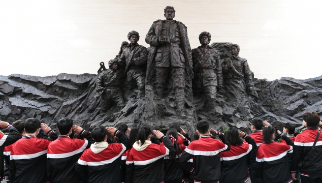 高聳的紅軍烈士紀(jì)念塔,狀如一顆緊弦待發(fā)的炮彈,矗立在五角星形的塔座上。在紀(jì)念碑與檢閱臺(tái)之間的地面上,“踏著先烈血跡前進(jìn)”八個(gè)蒼勁大字格外醒目。