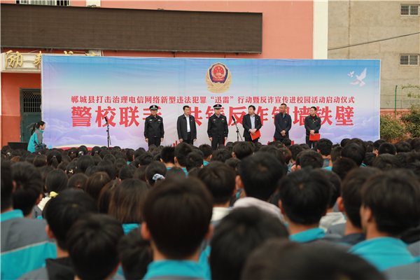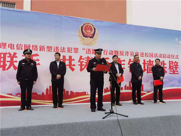 4月18日上午,鄲城縣打擊治理電信網(wǎng)絡(luò)新型違法犯罪“迅雷”行動暨反詐宣傳進(jìn)校園活動儀式在縣三高啟動??h政府副縣長、公安局長陳鳳祥,縣政府辦公室主任賈培民,縣教體局黨組書記、局長羅明黨等出席啟動儀式,縣打擊治理電信網(wǎng)絡(luò)新型違法犯罪工作各成員單位、縣公安局、縣三高分別組成代表隊2200余人參加啟動儀式,儀式由賈培民主持。