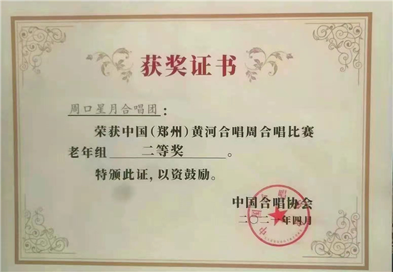 4月24日至27日,在河南鄭州舉辦的首屆“中國(鄭州)黃河合唱周”全國大賽中,周口星月合唱團(tuán)獲老年組二等獎(jiǎng)。這次由中國合唱協(xié)會(huì)牽頭舉辦的合唱大賽,全國共有72支隊(duì)伍參賽,劉楠、石孟嘵分別擔(dān)任合唱團(tuán)指揮和鋼琴伴奏。