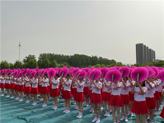 開幕式還舉行了彩扇舞、啦啦操、中國功夫、歌曲等文體表演。其中,彩扇舞《盛世花開》,由該校文化教育學(xué)院300名女生手持彩扇,跟隨著不同的音樂節(jié)奏變換著不同的色彩與隊(duì)形,依次拼出由鐮刀和錘頭組成的中國共產(chǎn)黨黨徽、象征體育精神的奧運(yùn)五環(huán)、“慶祝建黨100周年”、“周職20周年校慶”等圖形和字樣,表達(dá)著對(duì)黨的熱愛和對(duì)學(xué)校的祝福。表演者王真真說:“大家協(xié)同配合才能把節(jié)目表演好,這個(gè)節(jié)目我們排練了一個(gè)多月。雖然很辛苦,但是看到節(jié)目順利演出,感到很有成就感。”
