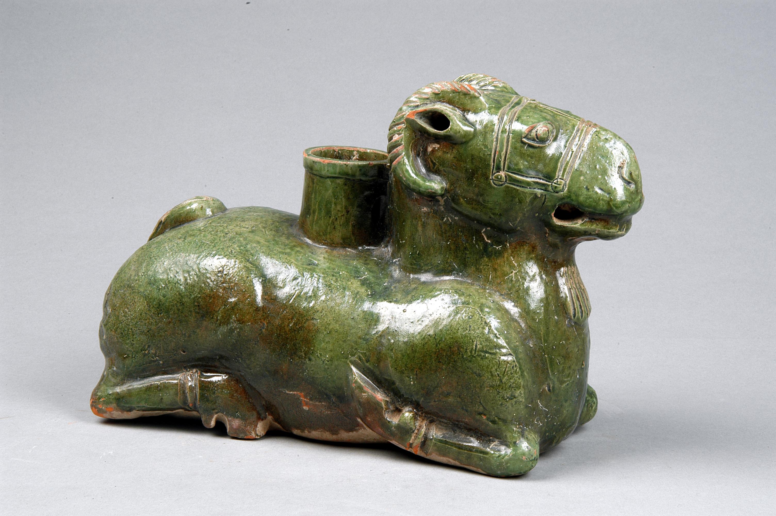 什么叫“尊”呢,就是你們現(xiàn)在說的酒杯。我就是用來喝酒的容器。關于造型呢,別期待我硬朗干練,我是寓意吉祥的一只小羊,是溫順善良的化身,線條流暢,神采奕奕。我身長36.6厘米,寬15.8厘米,高23厘米,口徑5.4厘米,臥姿跪地,嘴巴微張,紅陶質地,綠釉作為裝飾色彩,遍布全身,釉色碧綠明凈,是漢代鉛釉陶中的珍品。