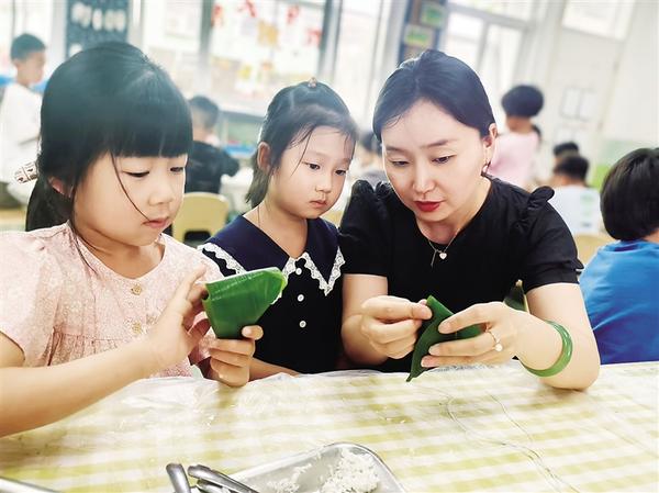 近日,一名幼兒園老師在指導(dǎo)孩子們包粽子。端午節(jié)前夕,周口市市直幼兒園舉辦“迎端午包粽子”活動(dòng),旨在培養(yǎng)孩子們的動(dòng)手能力,激發(fā)勞動(dòng)熱情,受到孩子們的歡迎。