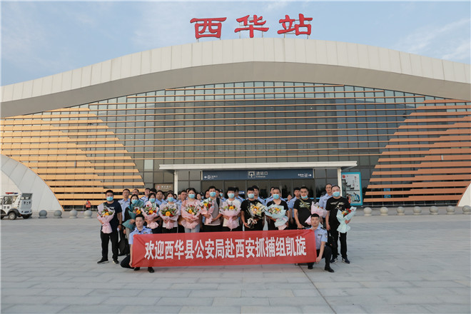 當(dāng)天,西華縣公安局在鄭阜高鐵西華站舉行歡迎儀式,迎接赴西安抓捕組凱旋歸來。特警在站臺(tái)上排列整齊、嚴(yán)陣以待,列車準(zhǔn)時(shí)??康秸荆?名犯罪嫌疑人隨即被押解下車,全副武裝的特警立即上前進(jìn)行押解交接,押往在高鐵出站口等候的裝甲車上。至此,歷經(jīng)三天三夜,一起電信網(wǎng)絡(luò)詐騙團(tuán)伙案成功告破。