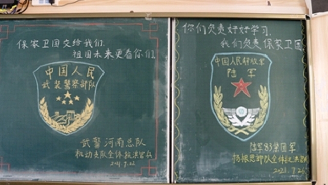 ??“保家衛(wèi)國交給我們,祖國未來更看你們!”“你們負(fù)責(zé)好好學(xué)習(xí),我們負(fù)責(zé)保家衛(wèi)國!”在鄭州市第七十三中學(xué)的一間教室里,參與救災(zāi)援助的抗洪官兵們給同學(xué)們留下了兩幅黑板報。在師生們眼里,這就是名副其實的“最美黑板報”。