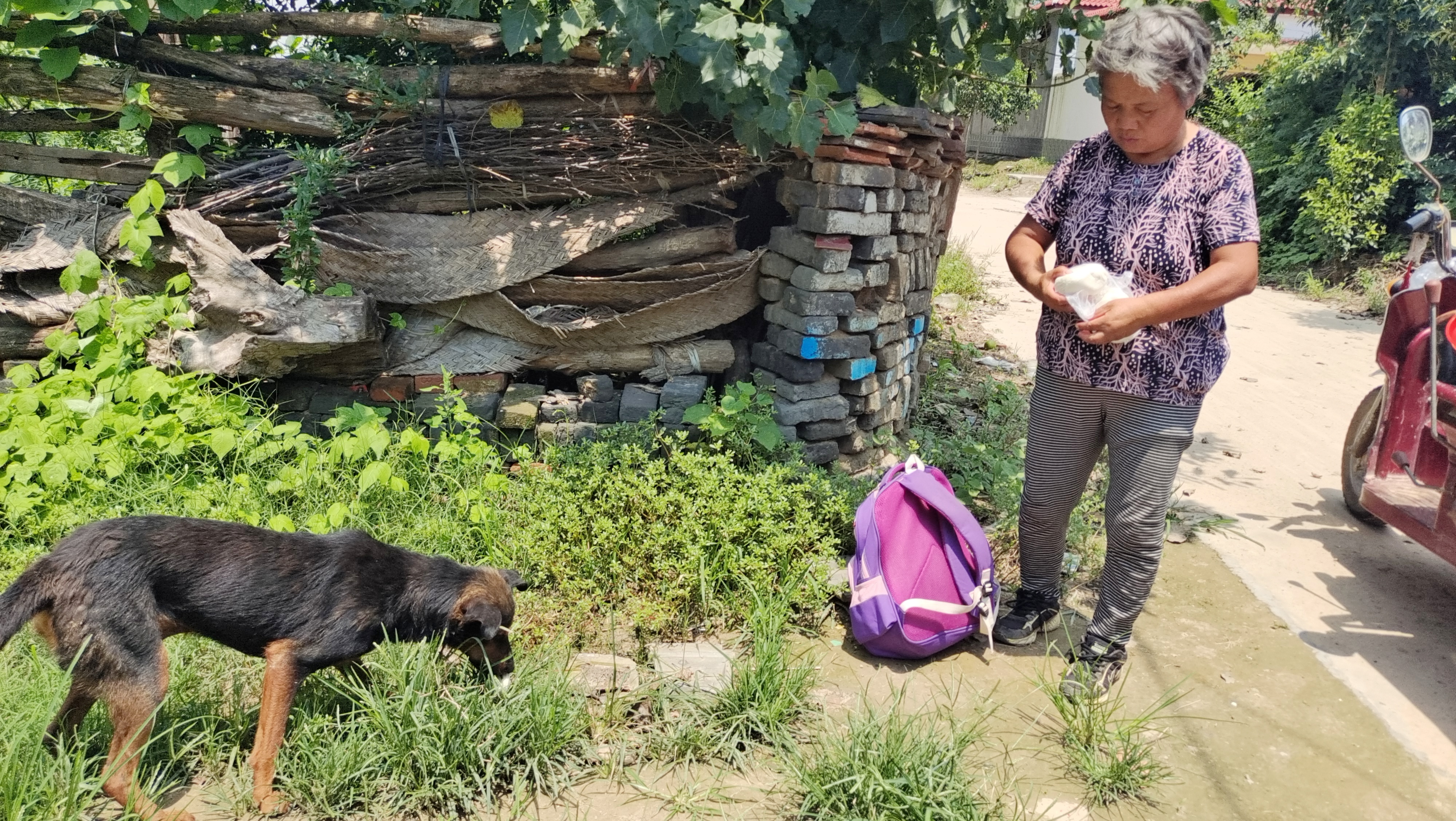 駛出不到幾百米,張梅碰到鄰居王妞的電動三輪車沒電了,這可讓王妞急出一把汗。她們一商量,就在車上找了一段舊條幅,由張梅的機(jī)動三輪車牽著王妞的電動三輪車?yán)^續(xù)趕路。