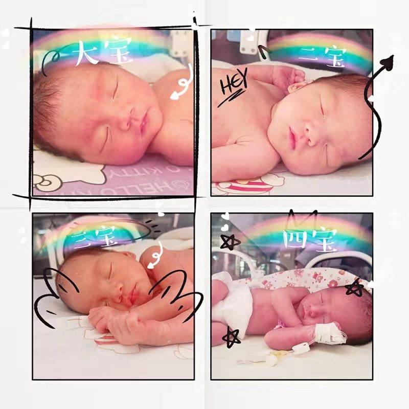 7月25日1時02分、03分、03分、04分隨著一陣陣啼哭聲,產(chǎn)婦經(jīng)剖宮產(chǎn)“三鳳一龍”四胞胎相繼出生,體重分別為2180g、2120g、2030g、1520g,全身紅潤,哭聲響亮,被安全送入危重新生兒救治中心監(jiān)護室進行重點監(jiān)護。