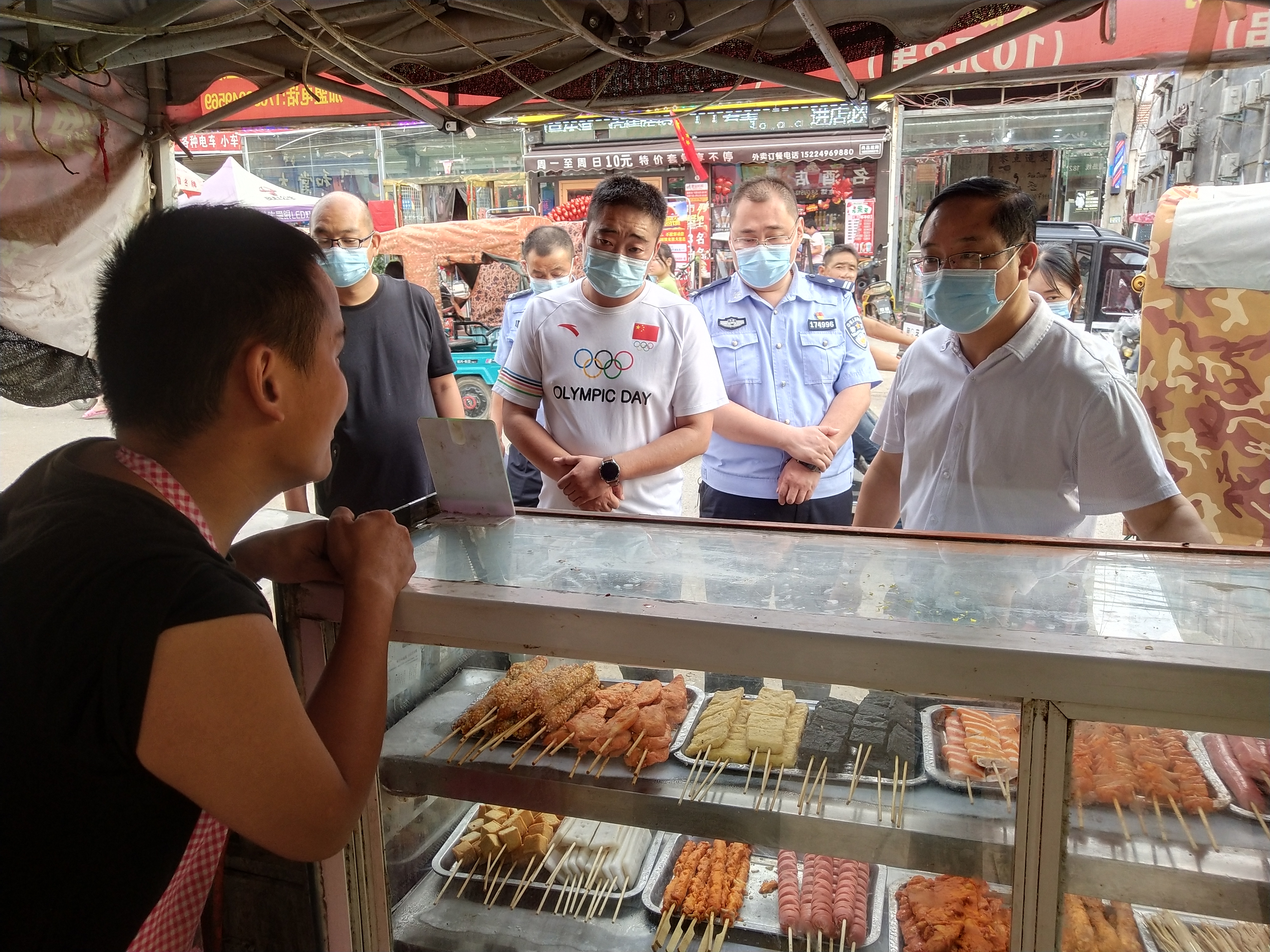 隨后,段文海一行又來到“佰宜家”生活超市,重點檢查了消防器材、應急安全設備以及疫情防控,指導超市負責人認真制定應急預案,完善工作舉措,確保國慶假期安全穩(wěn)定。“你們賣烤鴨使用液化氣不安全,必須立即整改……”“你們做油炸雞腿原料從哪采購的?占道經營不行啊……”在集市流動攤點,檢查人員一針見血指出了存在的問題?!澳銈兊碾娋€老化、私拉亂扯有安全隱患必須盡快換掉,煙霧報警器沒有安裝到頂上需要重新調整位置,你講講如果發(fā)生火災如何使用滅火器……”在集市沿街商鋪暗訪檢查時,段文海等對一家床上用品專賣店業(yè)主提出嚴厲批評。派出所長蘇叢博、副所長劉來自現(xiàn)場傳授消防知識并給其下發(fā)了《限期整改通知書》。