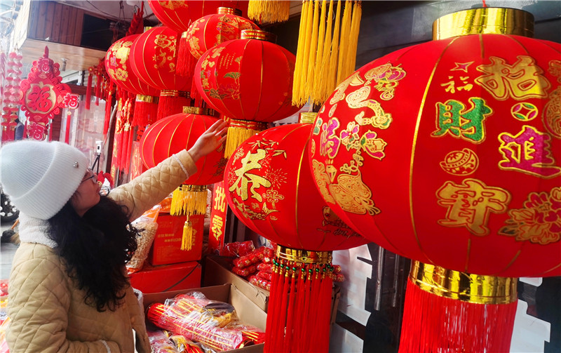 1月27日,市民在認真挑選著新年的裝飾品。春節(jié)臨近,虎年生肖飾品、對聯(lián)、中國結(jié)、福字、大紅燈籠等“紅色年貨”火了年貨市場。據(jù)了解,各種寓意祥和的春聯(lián)、以老虎為主題的各種窗花、各種飾品最受市民歡迎。③10