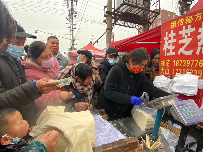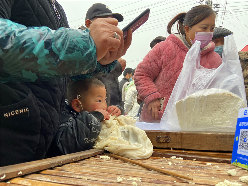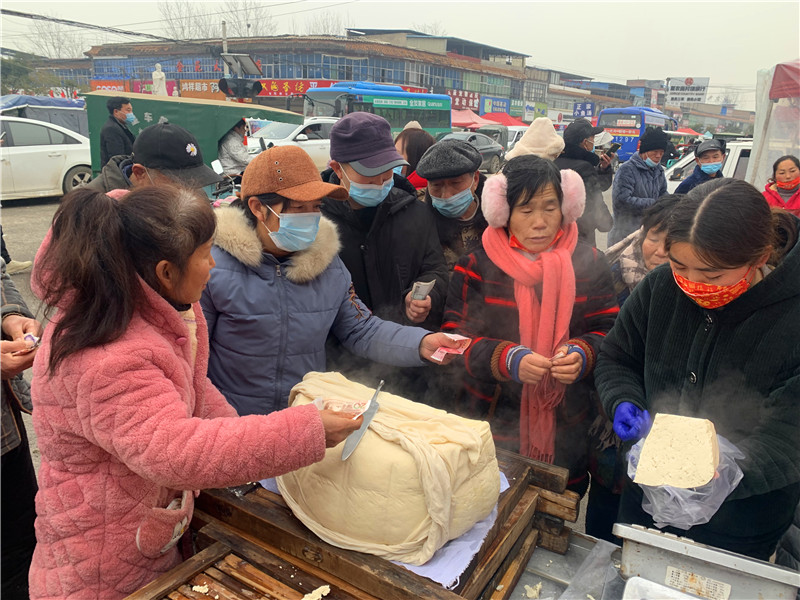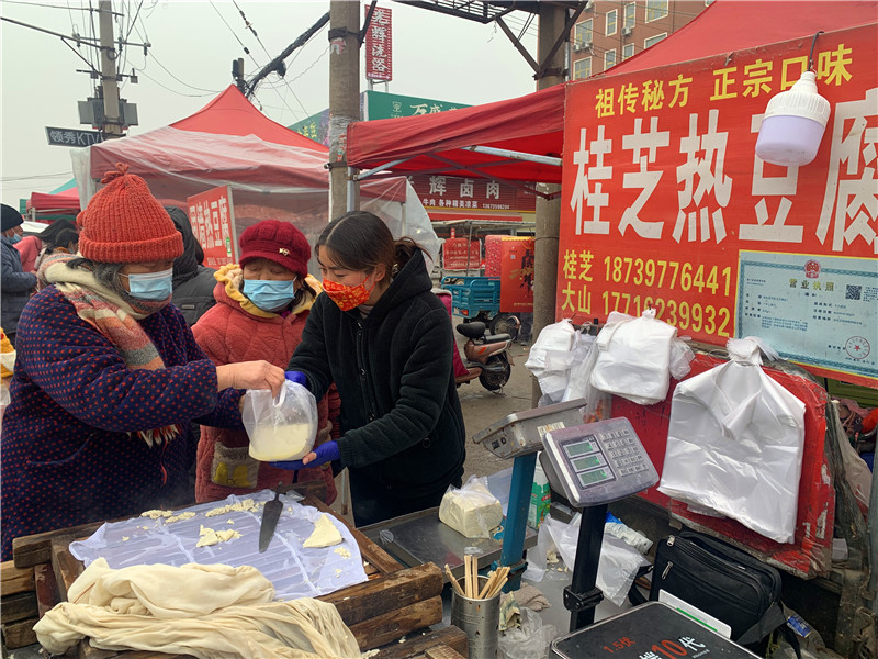 在固墻鎮(zhèn)的集市上,“桂枝熱豆腐”攤位前的顧客絡(luò)繹不絕?!敖o我來50塊錢的豆腐”“我要20斤,先給我切豆腐吧”“我要30斤,多少錢”……人群將豆腐攤里三層外三層圍了起來,從人群外朝里看看不見豆腐,只看到豆腐攤里冒出來的團團熱氣。“等了半個小時了,剛才那一盒豆腐沒輪到我就賣完了,這才搶到手。”附近的村民楊大爺拿著剛買的豆腐高興地說。“我從鹿邑來的,姐姐在里面擠著買豆腐,我在這兒等她呢?!?歲的張家瑞說,她每年放寒假都會和家人一起到固墻來探親,過年的時候逛逛集市,順便買些豆腐帶回鹿邑。