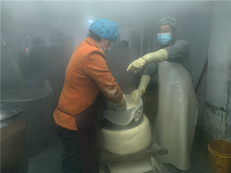 “旋乾磨上流瓊液,煮月鐺中滾雪花?!?月27日上午,聞著一股豆花香,記者走進商水縣固墻鎮(zhèn)老朱家豆腐店,豆腐坊里工人們正忙得不可開交。工人將泡夠時間的豆子從水里瀝出來放進磨豆機里,看著腫胖的黃豆在磨豆機的驅(qū)動下蹦蹦跳跳地等待著“變身”,聽著呼呼啦啦的機器聲,磨豆機的出漿口處暖黃色的漿液噴涌而出,不一會兒,等待接收漿液的桶被灌滿。在熬漿處,三口大鍋排排“坐”,爐火越燒越旺,鍋里乳白色的豆汁不停地翻騰?!盎鸷蚝苤匾静坏絼艃翰缓贸?,每一鍋都要大火熬制20分鐘左右?!崩现煺f,外面買豆腐的人越多,他們干得越起勁兒。起豆腐是最重要的一個環(huán)節(jié),需要很大的氣力和技巧,要二人通力協(xié)作完成,一人將點好的豆花舀進一個用紗布縫制的“大網(wǎng)”里,另一人左右晃動“大網(wǎng)”將鹵汁排出,經(jīng)過循環(huán)往復(fù)操作,豆腐初見雛形。這還不算完,只見工人將“大網(wǎng)”周圍設(shè)置木筷子固定,把重百余斤的石頭放置上方壓著。“固定形狀,再壓壓水,這樣做出來的豆腐緊實,口感好?!惫と丝祹煾嫡f。