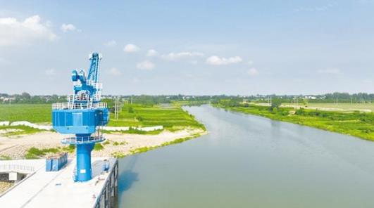 盛夏七月,在項(xiàng)城市東部的項(xiàng)城港,幾架“高聳入云”的新式固定式起重機(jī)的主體已安裝完畢,剩余的部件堆放在地上,巨大的框架和鮮紅的涂裝展示著它們的力量。一側(cè),千噸級(jí)貨輪正??吭陂L(zhǎng)長(zhǎng)的泊位前,起重機(jī)緩緩卸下貨艙內(nèi)的散貨。